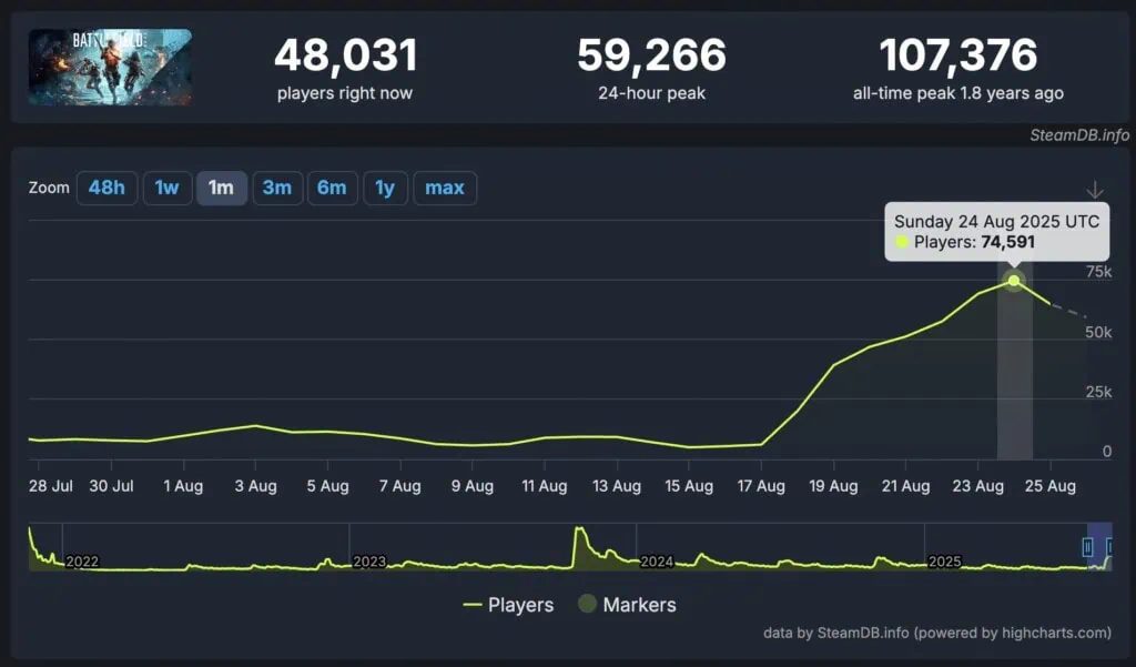 Według danych z platformy SteamDB, Battlefield 2042 w ostatnich dniach zaliczył niemal 10-krotny wzrost liczby graczy. 24 sierpnia 2025 roku w grze jednocześnie bawiło się niemal 75 tysięcy graczy, co jest ogromnym wzrostem względem 7 tysięcy sprzed bety Battlefielda 6. Obecnie w BF2042 gra około 50 tysięcy osób, co nadal jest bardzo dobrym wynikiem jak na ten tytuł.