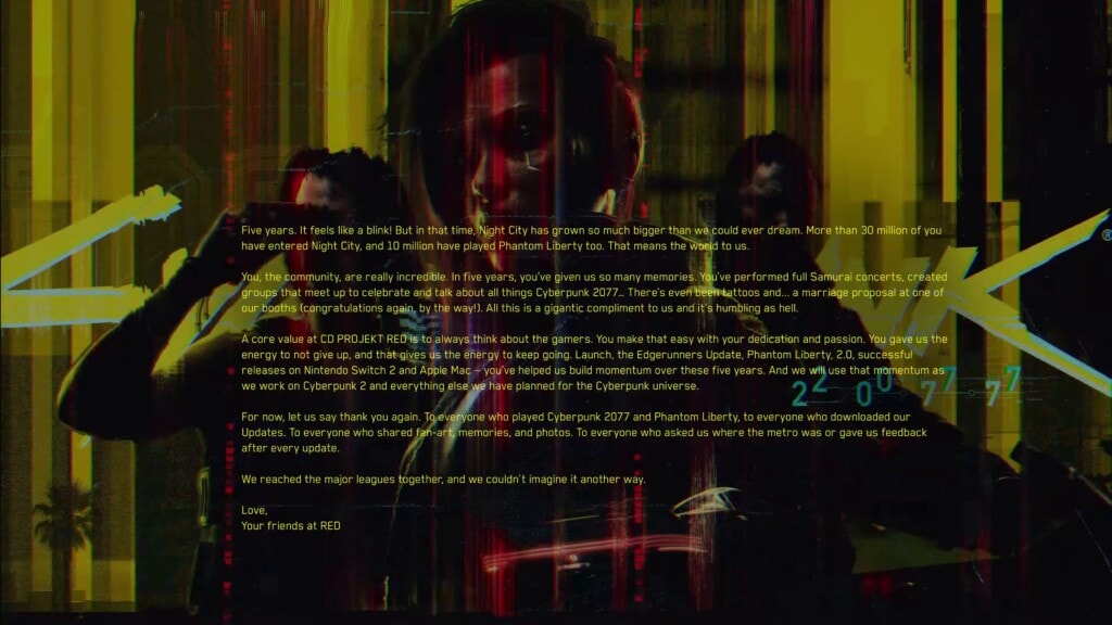 Podstawową wartością CD PROJEKT RED jest ciągłe dbanie o graczy. Wasze zaangażowanie i ogromna pasja sprawiają, że to zadanie jest łatwe. Daliście nam energię, by się nie poddawać, a to z kolei napędza nas, by iść dalej. Premiera, aktualizacja Edgerunners, Phantom Liberty i aktualizacja 2.0, a także udane wydania na Nintendo Switch 2 i Apple Mac – dzięki Wam przez te pięć lat nabraliśmy ogromnego rozpędu.