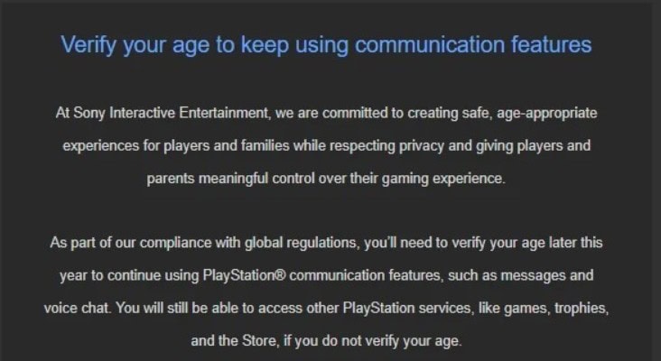 Niektórzy użytkownicy PlayStation otrzymali wiadomości dotyczące planowanego wprowadzenia weryfikacji wieku. Sony nie podało dokładnej daty rozpoczęcia tego procesu, jednak wspomnieli, że ma to nastąpić jeszcze w tym roku. W przypadku braku spełnienia tego wymogu, gracze stracą dostęp do czatu głosowego oraz wiadomości. Warto jednak podkreślić, że dotyczy to na razie obywateli Wielkiej Brytanii i Irlandii. Na razie weryfikacja wieku jest tam opcjonalna, jednak od czerwca 2026 roku ma być obowiązkowa.