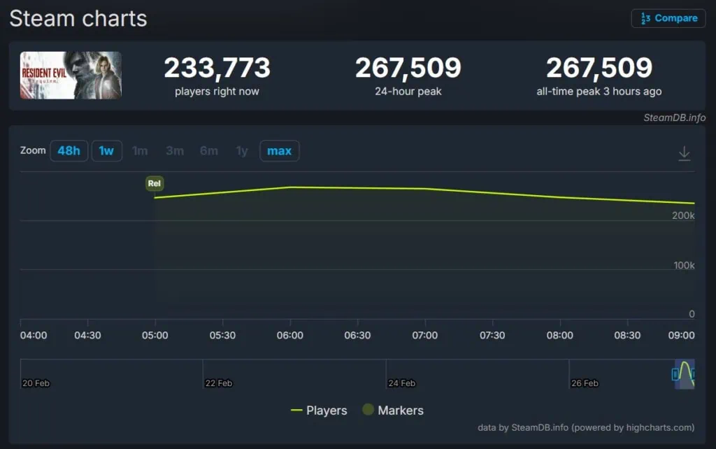 Jak podaje SteamDB, aktualny rekord graczy w jednym momencie w Resident Evil Requiem wynosi 267 509. To najlepszy wynik w historii serii. Dla porównania Resident Evil 4 z 2023 roku uzbierał max 168 191 graczy zalogowanych w tym samym , a Resident Evil Village 106 631. Należy pamiętać, że to liczby wyłącznie ze sklepu Valve, faktyczny wynik wliczający graczy konsolowych może być znacznie większy.