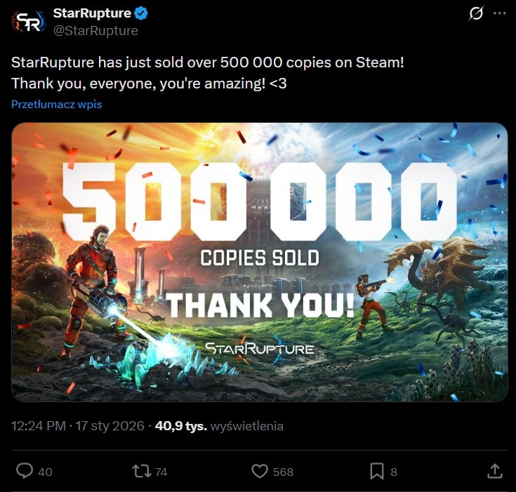 Warto zaznaczyć, że wynik ten dotyczy tylko platformy PC. StarRupture jest dostępne aktualnie tylko na Steam, gdzie tytuł rozszedł się w ilości 500 tys. kopii. To wynik godny podziwu i tylko pokazuje, że studio Creepy Jar ma w swoim katalogu kolejny hicior. Ich poprzednia gra Green Hell do końca 2025 roku sprzedała się w ilości 9 mln kopii.