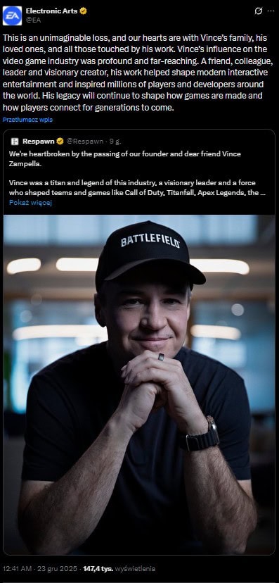 Vince Zampella jest wręcz ojcem gatunku FPS, sprawował on bowiem pieczę nad serią Call of Duty, choć pomógł również przy takich produkcjach jak Apex Legends, czy Battlefield 6. Wieść o jego śmierci zaskoczyła wszystkich.